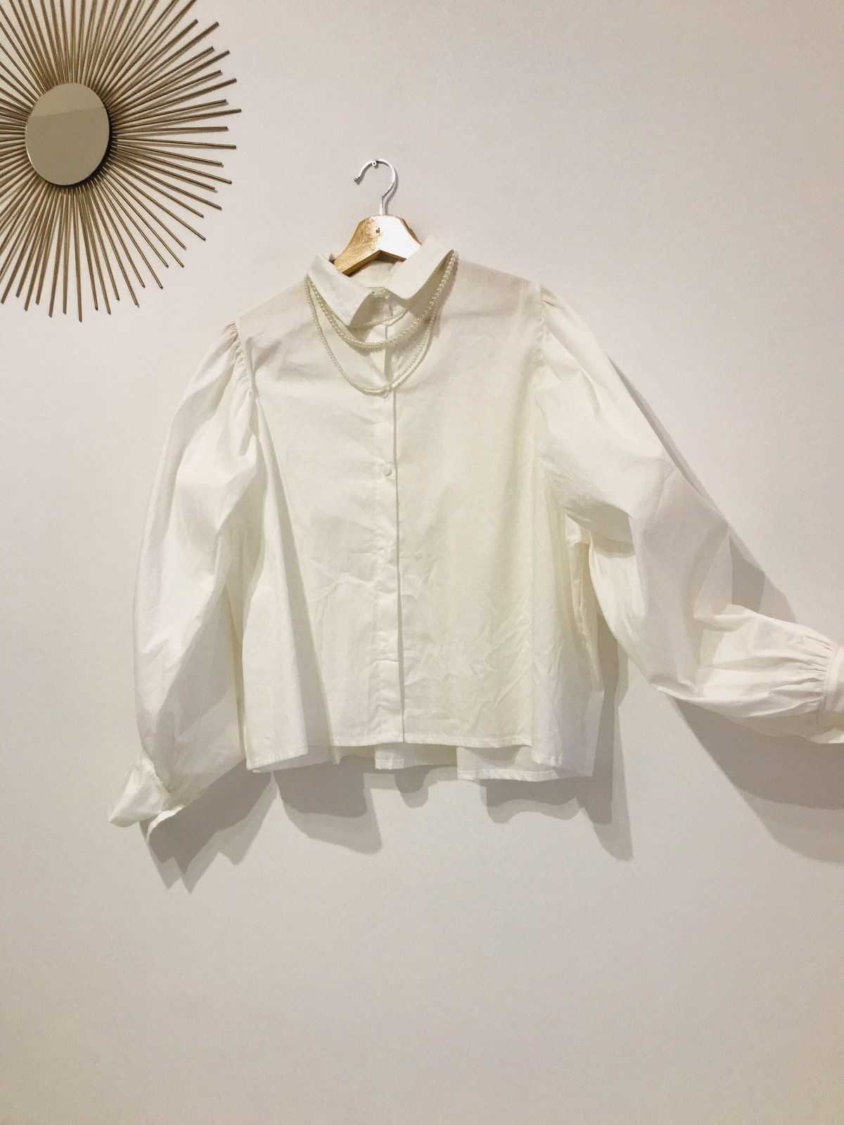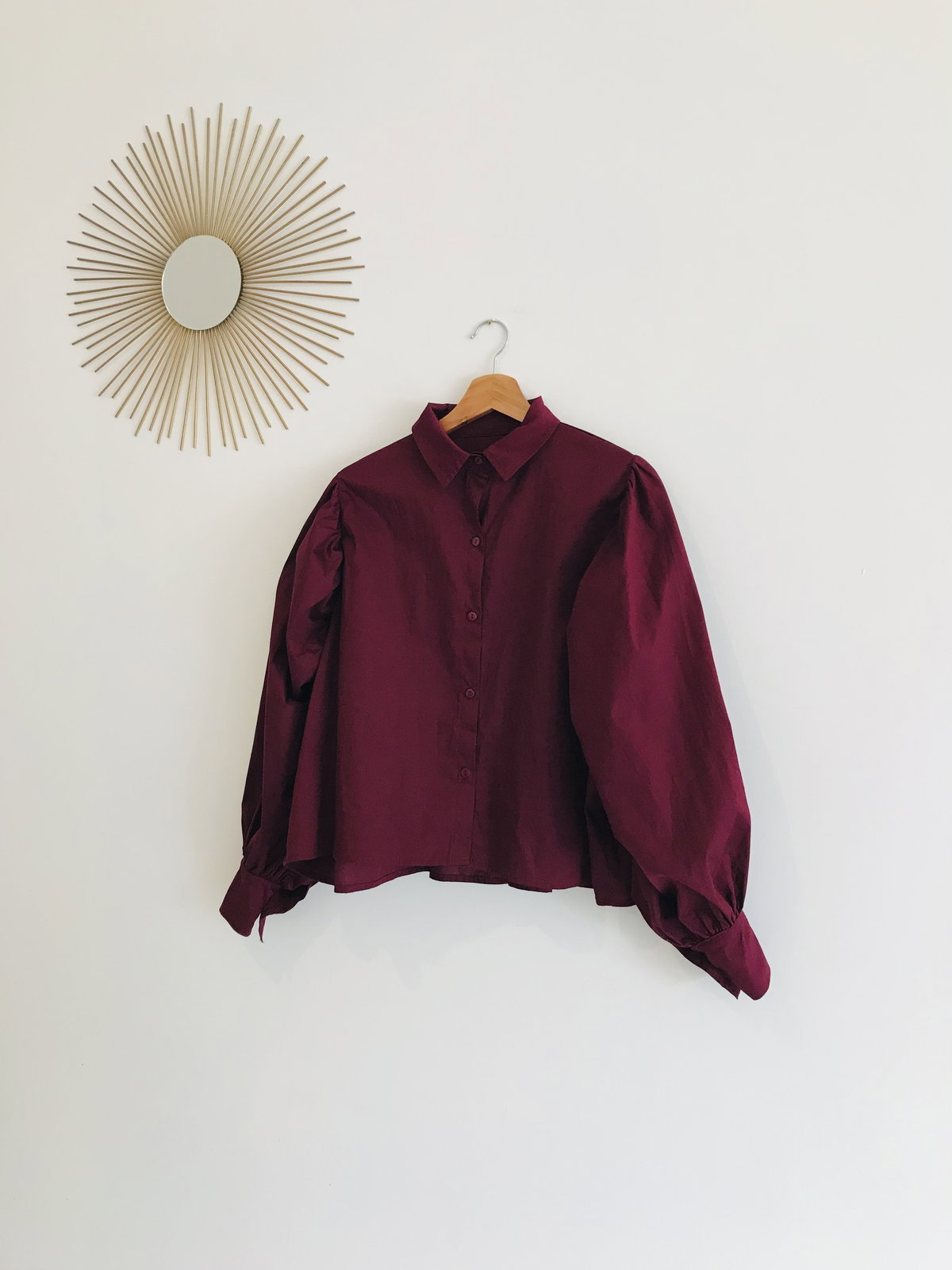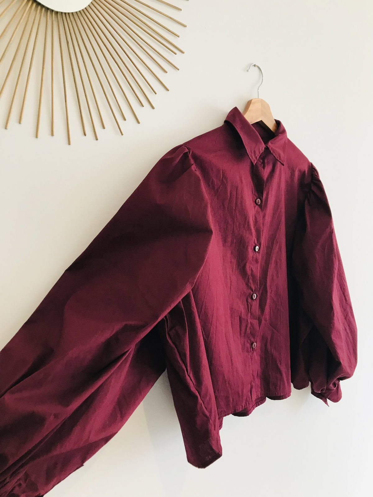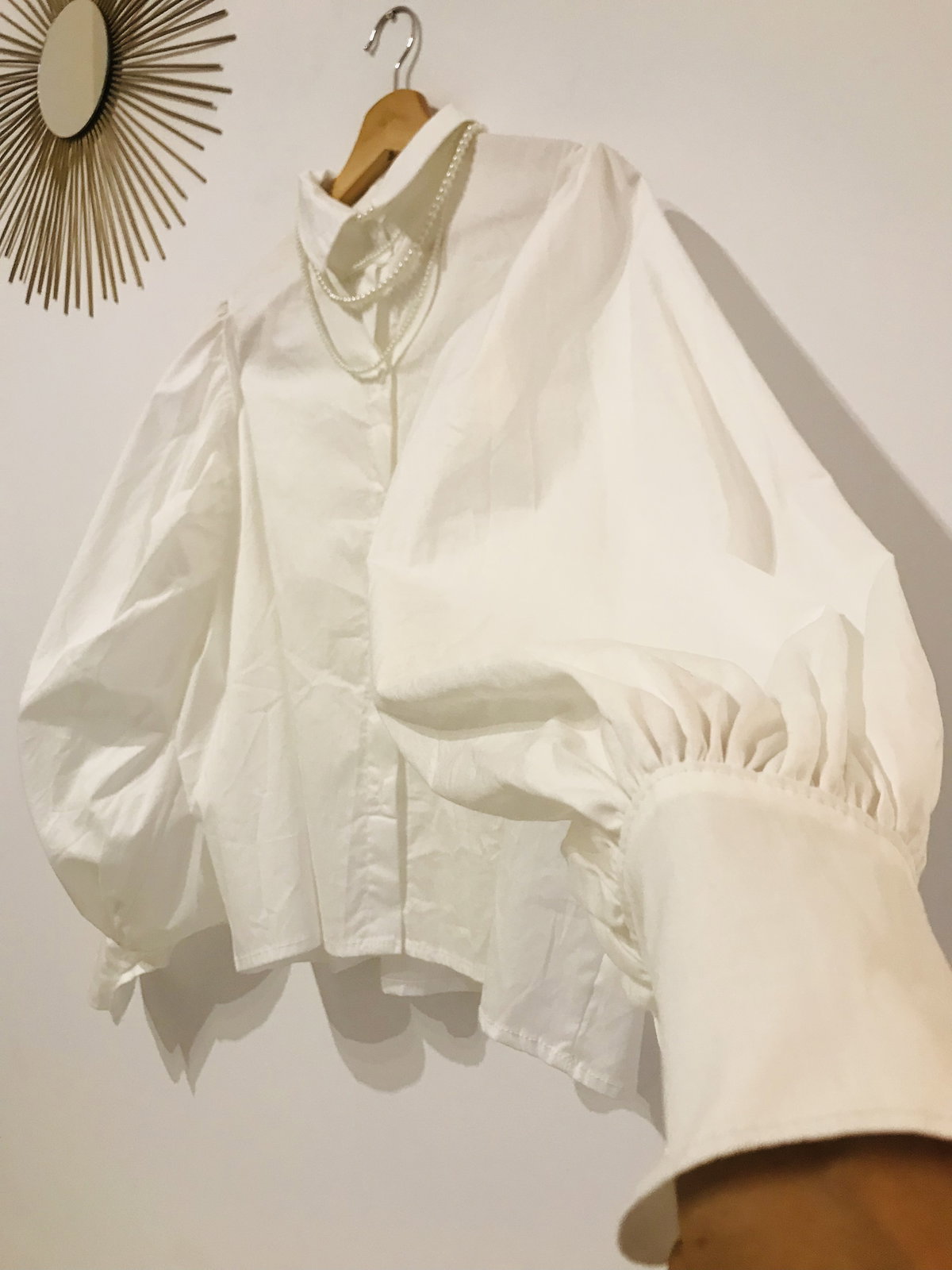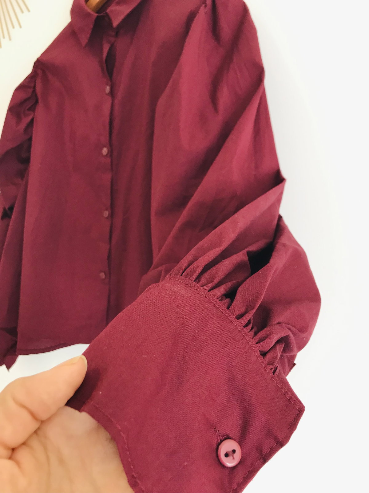Una camisa con volumen y carácter, el diseño tiene mangas globo bien fruncidas que terminan en puños ajustados