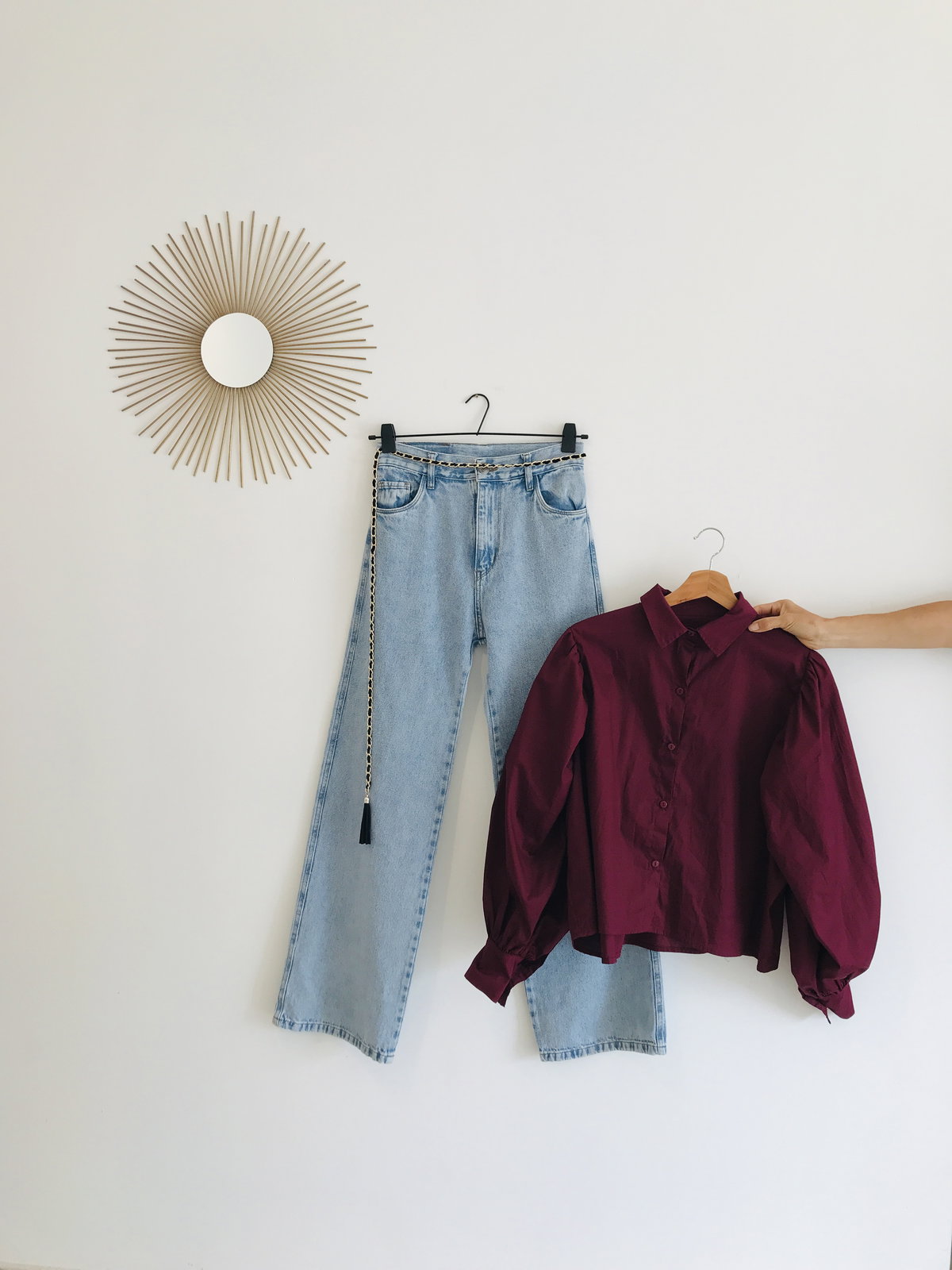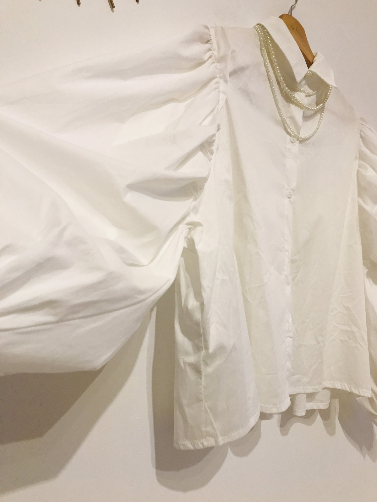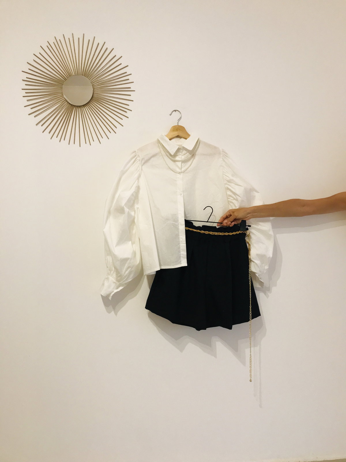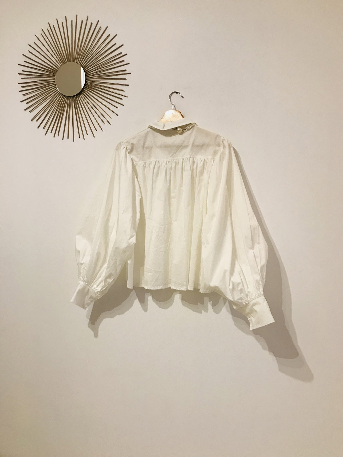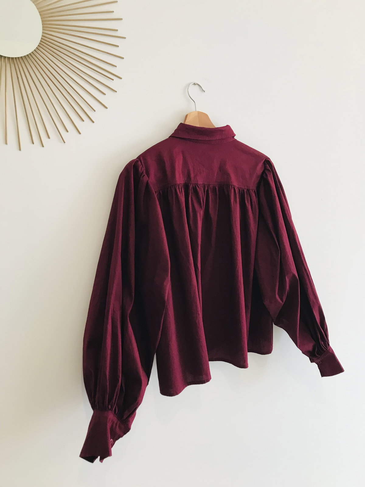 Una camisa con volumen y carácter, el diseño tiene mangas globo bien fruncidas que terminan en puños ajustados