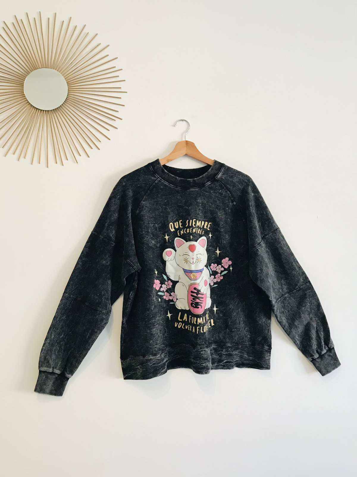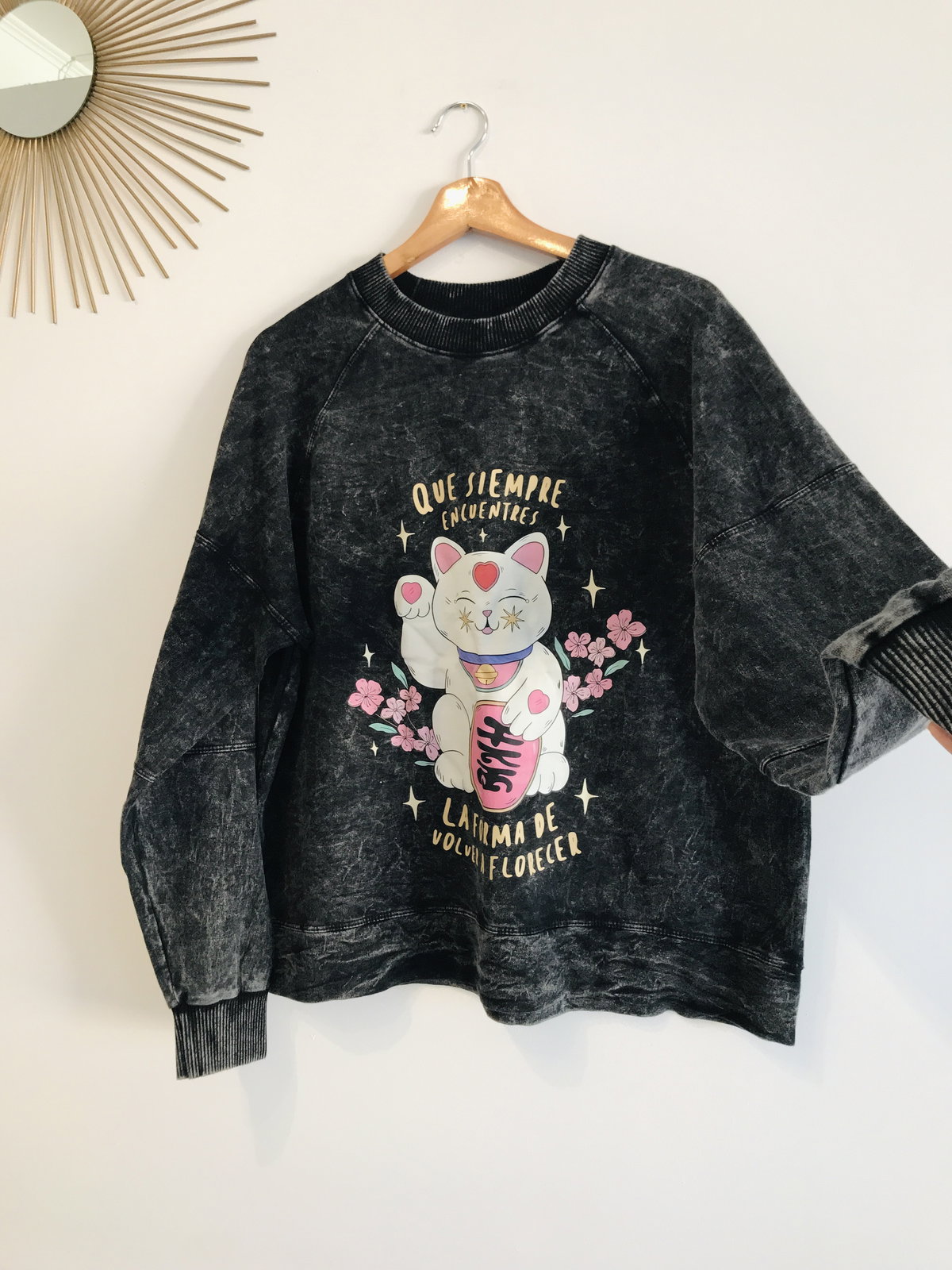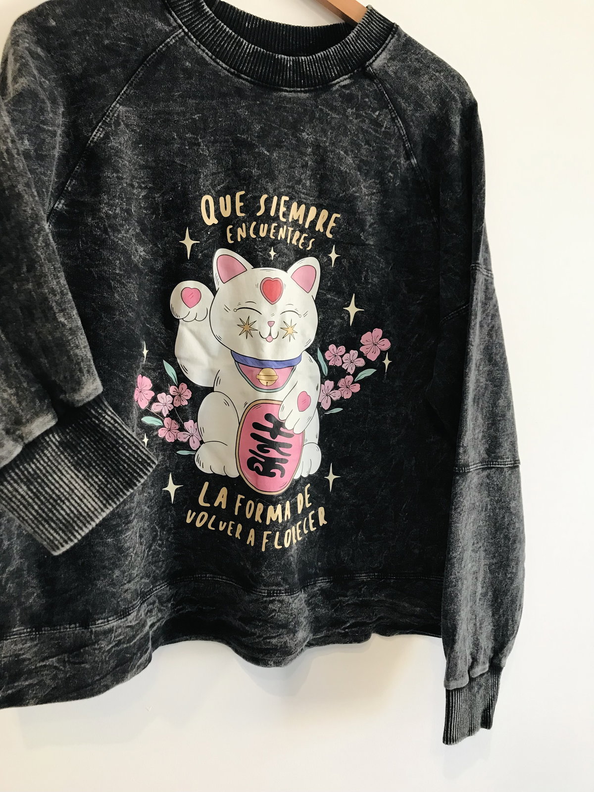 El mensaje más hermoso para llevar en una estampa esta con este gato de la fortuna, un buzo corte oversize.