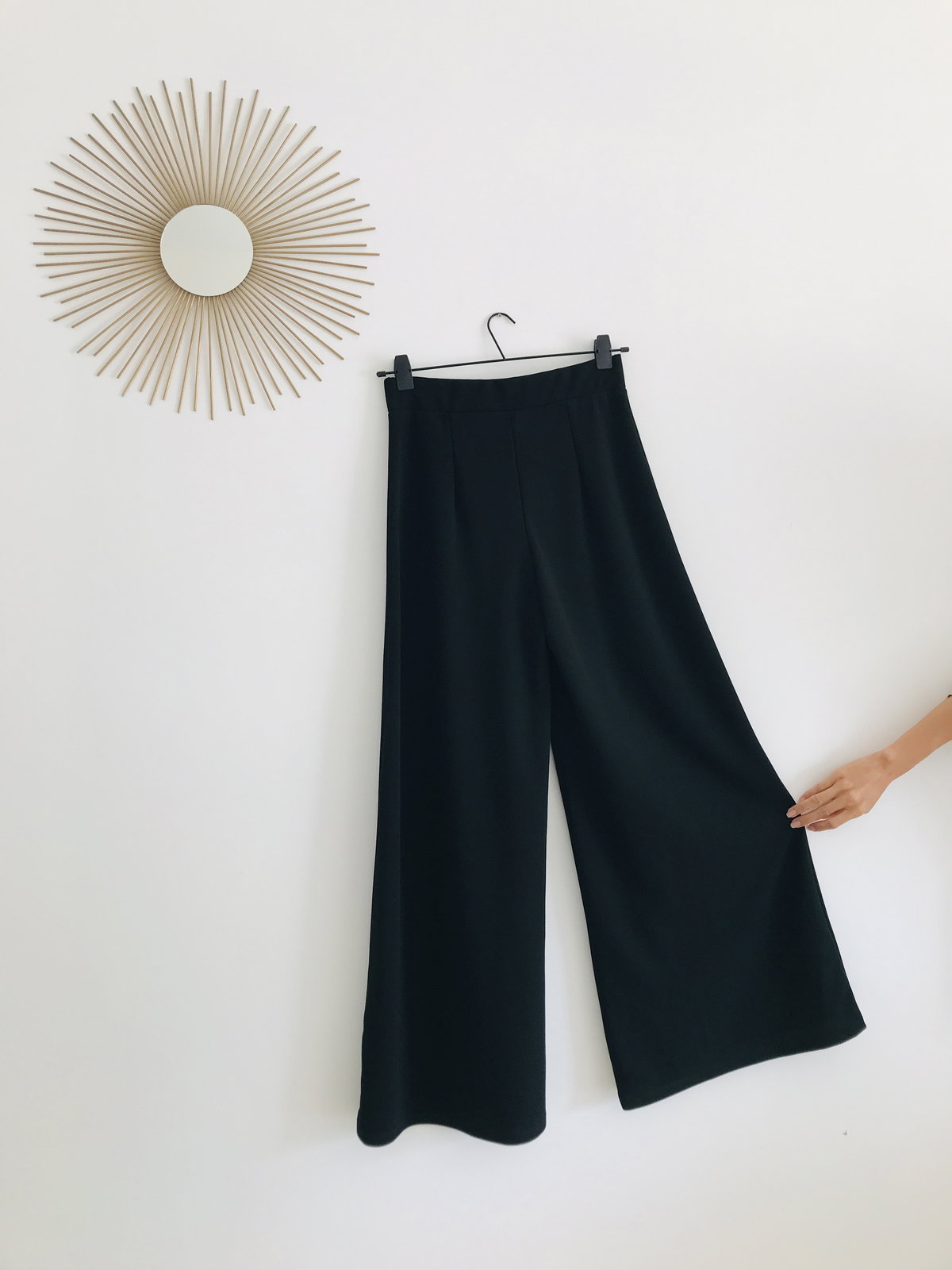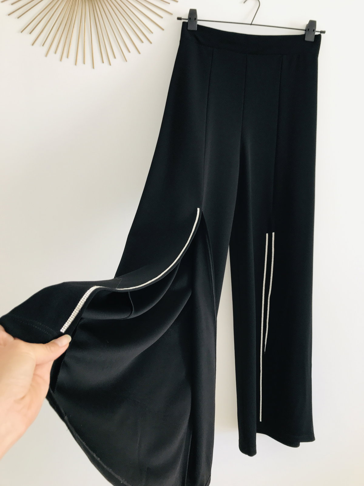 Palazo de crepe súper pesado, sostiene todo! Con pinzas y elástico en la cintura. Los tajos en sus piernas están acompañados de un sutil ribete plateado