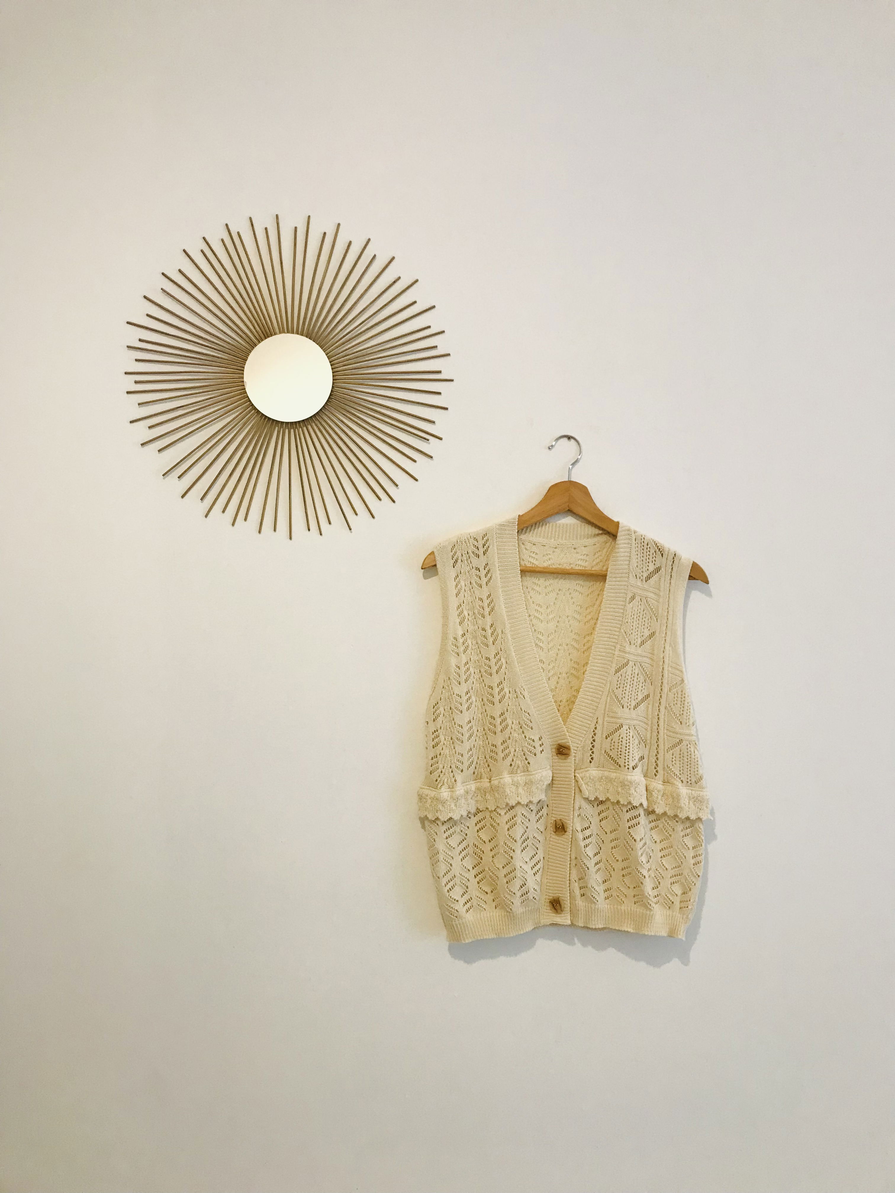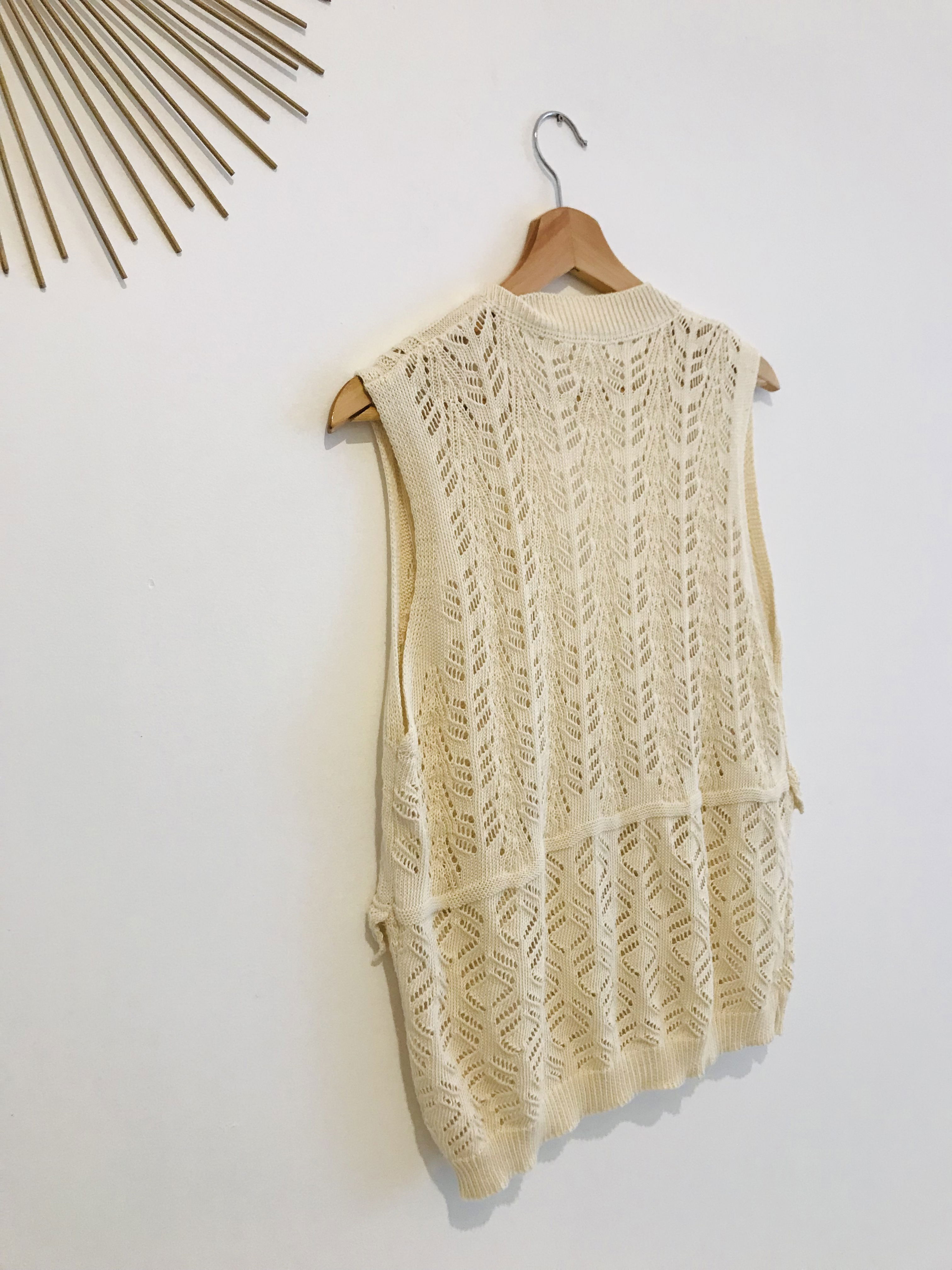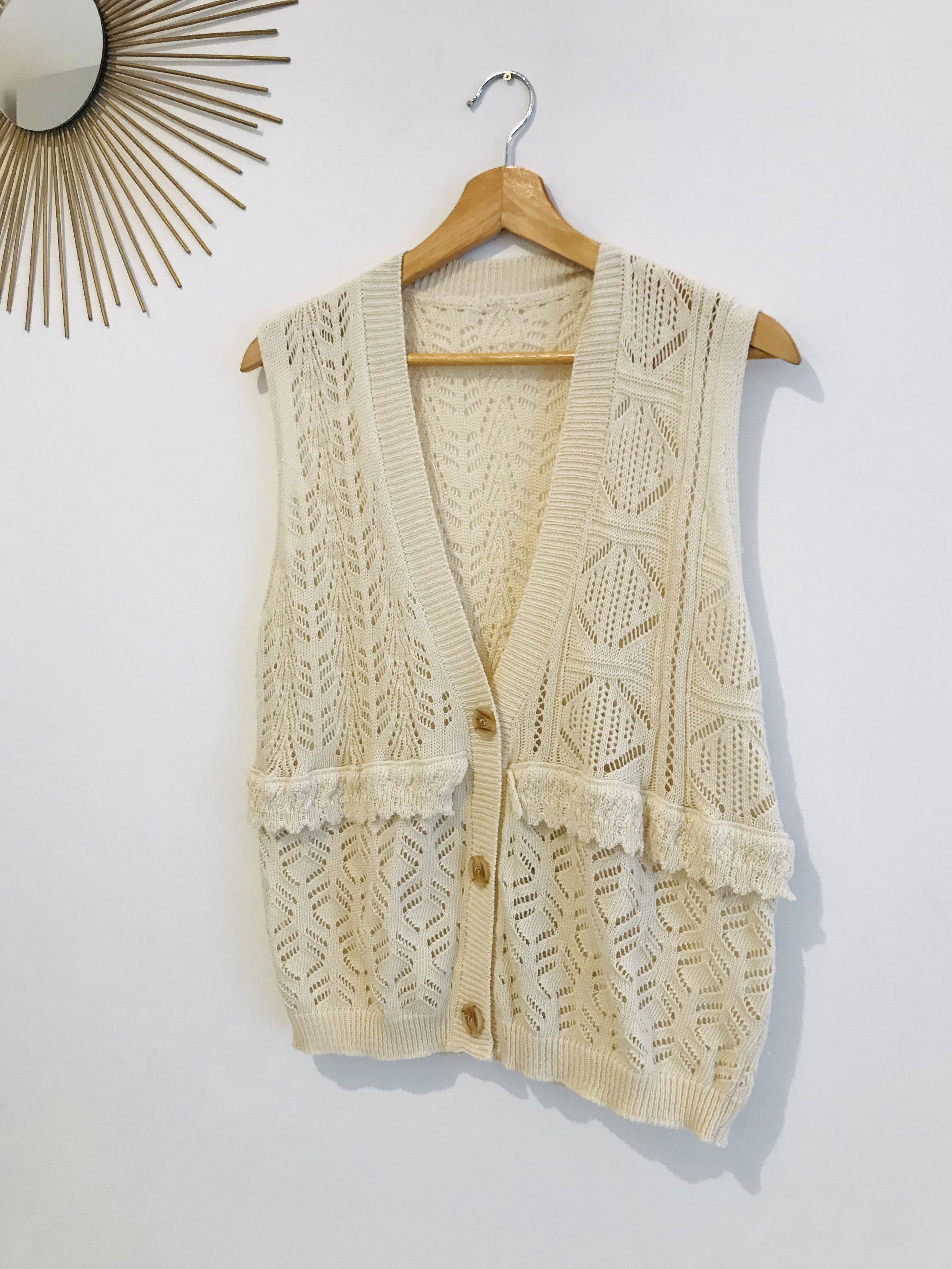 Chaleco tejido color crudo, tres botones y detalle de volado delantero